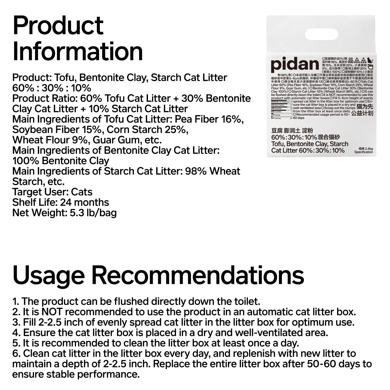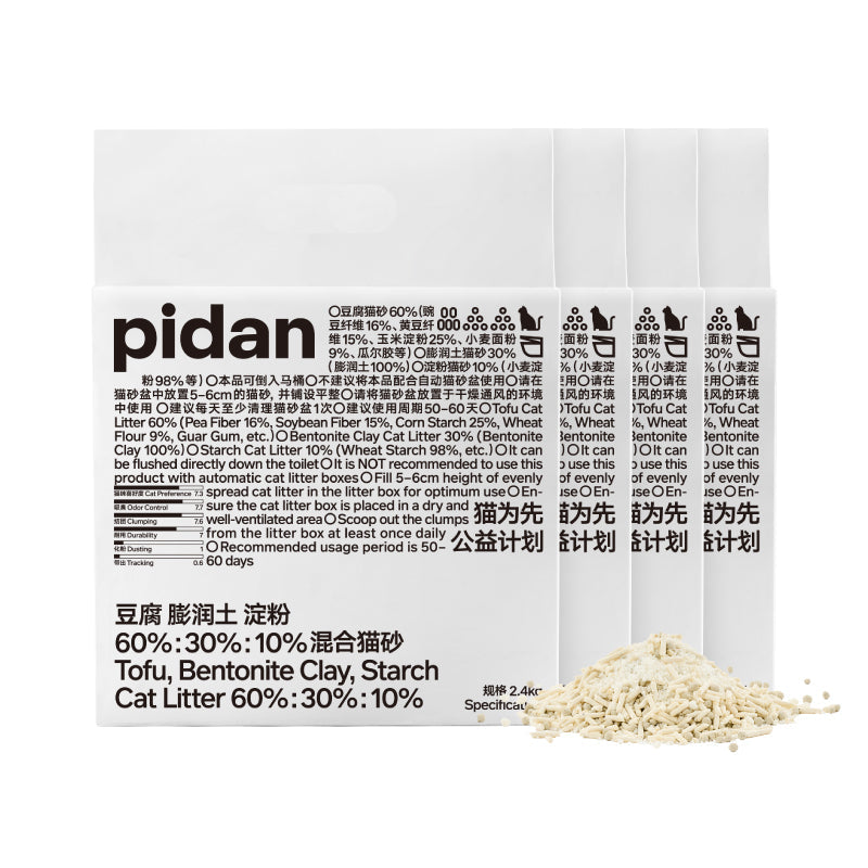 Tofu Cat Litter (60%): Made from pea fiber, soybean fiber, corn starch, wheat flour, and guar gum. Now enhanced for better durability and odor control.